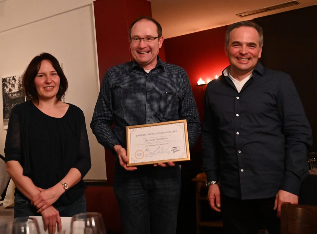 Bei einem gemeinsamen Abend zur Ehrung unseren ehemaligen längjährigen Vorstands wurde Josef Ostermeier von der neuen Vorstandschaft zum Ehrenmitglied der Quintessenz e.V. ernannt.v.l.: 2. Vorstand Mona Lüpken, Ehrenmitglied Dr. Josef Ostermeier, 1. Vorstand Markus Rummel